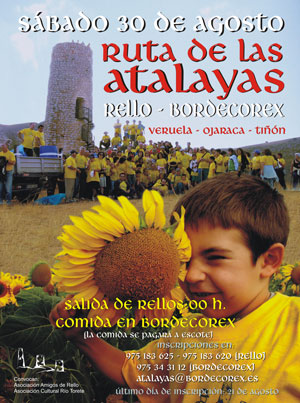 Un año más, la Asociación Amigos de Rello y la Asociación Cultural Río Torete de Bordecorex convocaron a la Ruta de las Atalayas. Una cita que se ha hecho imprescindible para los pueblos de la comarca y que sigue congregando a numerosos caminantes. El último fin de semana de agosto es la fecha escogida coincidiendo con el fin de las vacaciones de muchos veraneantes. Este año el sentido de la marcha comenzó en Rello para acabar en Bordecorex.