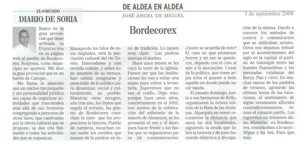 De aldea en aldea: Bordecorex septiembre 3, 2008 Noticia publicada en el Diario de Soria sobre nuestro pueblo